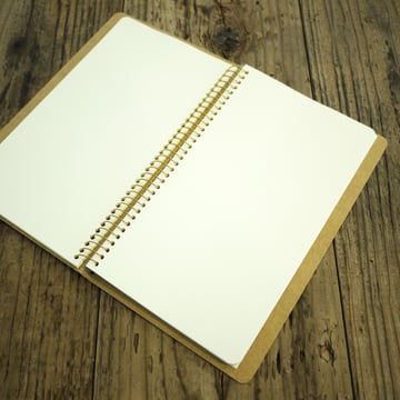 スパイラルリングノートのクラフト地の表紙に箔押しされた、
