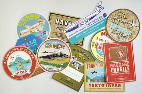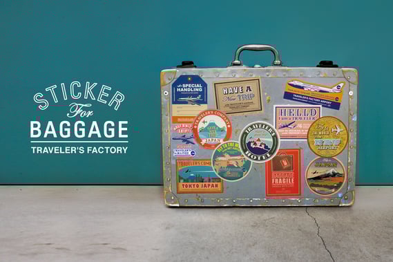トラベラーズファクトリー エアポートにて、スーツケースに貼るのにちょうど良いトラベラーズファクトリーオリジナルのバゲッジステッカーを発売中。日本を旅した証になるようなデザインから、旅の安全を願うメッセージ、ネームが記入できるもの、トラベラーズエアーのエアラインステッカーをイメージしたものなど、デザインは12種類。デザインによってステッカーの素材を変えています。旅を重ねるほどに、傷が付いたり、色がかすれたりしますが、素材によって味の出かたにも違いがあります。いろいろなデザインのステッカーを重ねて貼ることで、その変化をより楽しむことができます。ぜひ、スーツケースをカスタマイズするように、ベタベタ貼ってください。きっと旅がもっと楽しくなるはずです。