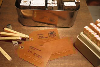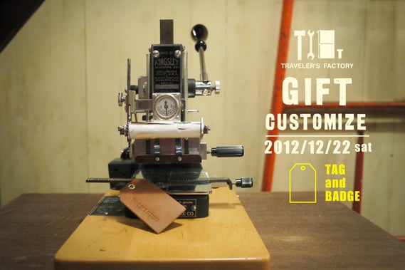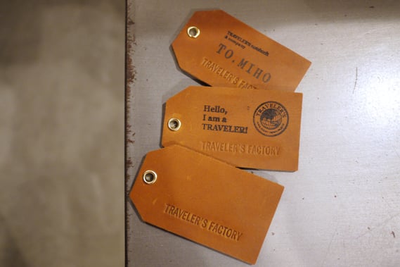 ギフトタグ カスタマイズは、キャメルの革を使用した無地のタグに、ホットスタンプマシーンを使って「TRAVELER'S FACTORY」のロゴを刻印したり、スタンプなどで名前やメッセージなどをデザインして、自分だけのオリジナル革タグが作ることができます。