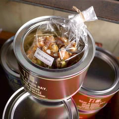 ひとつめは、トラベラーズビスケットでおなじみのダン・ラ・ナチュール特製、「カリカリナッツキャンディー」です。4種類のナッツ(くるみ、ヘーゼルナッツ、アーモンド、ピーカンナッツ)を飴がけしたものです。ナッツと飴のかりかりとした食感と、ほろ苦く香ばしい風味はコーヒーやお茶、そしてお酒にもよく合います。ペンキ缶をイメージしたデザインのトラベラーズファクトリーオリジナル缶に入れました。ギフトにぴったりなおやつです。