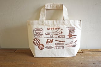 コットンバッグには、ブラニフのチケットやタグ、記念封筒などに使われていたさまざまな年代のロゴやキャンペーンのグラフィックをレイアウトしました。マチがついた小ぶりの使いやすい厚手の帆布で作ったコットンバッグです。このバッグとともに街を歩けば、ちょっとしたお出かけも旅気分です。
