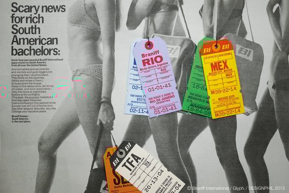 当時アメリカで唯一のコンコルドを所有し、世界初のペイント飛行機を飛ばしジェット族と呼ばれる新しい世代を作り上げることになった航空会社=それがブラニフ航空です。ミッドセンチュリーモダンの巨匠ジラルドのトータルデザインによる、ミュージアムのような空港ロビーや機内、ファッションショーを彷彿とさせるFA をはじめとするスタッフの制服はプッチデザイン、世界初の機体へのペイントをカルダーが手がけるなど、蒼々たるメンバーのクリエイティブは、1960 年代~70 年代の最新トレンドを乗せた飛行機として世界中の注目を集めました。その後、1982 年に就航を停止。現在は伝説のエアラインとして、多くのファンに支持されています。