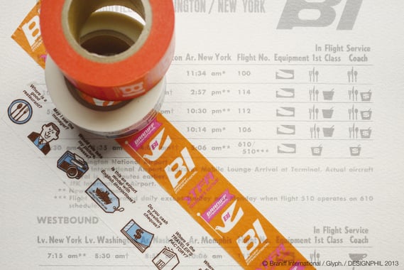 アレキサンダー・ジラルドによってデザインされたヴィヴィッドな色彩のブラニフ・ロゴをあしらったデザインと、機内で配られていたトランプに描かれていた旅のひとこと会話集のようなイラストと英語の台詞をレイアウトした2種類のマスキングテープです。ノートやカードに貼ってカスタマイズすれば気分は、ブラニフの機内グッズです。