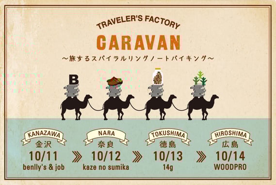 それぞれの街で、その場で自分だけのノートを作ることができる人気イベント、スパイラルリングノートバイキングを開催します。もちろん、トラベラーズファクトリーのオリジナルプロダクトもすこしですが持っていきます。さらに、1回目のキャラバンを記念し、イベント限定マスキングテープやカンバッジも製作予定です。
