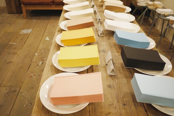 まずは、イベントオリジナルのロゴが箔押しされた表紙を手にとって、定番の白やクリームのMD用紙やポケットの中紙をはじめ、質感のある紙や味のある紙、カラフルな紙など、ずらりと並んださまざまな種類の紙の中からバイキング気分でお好きな紙を選びます。そして、選んだ紙を自分の好きなページ順に重ねます。1枚ずつ色を変えたり、最初と最後にポケットを付けたり、好きなようにアレンジできます。