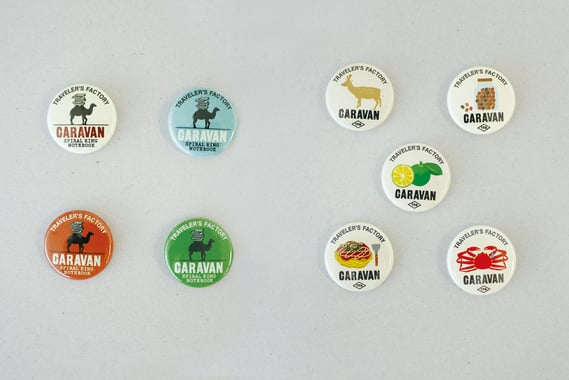 限定カンバッジもご用意します。バッジタイプと、トラベラーズノートのゴムに通しても使えるチャームタイプの2種類のバックパーツからお選びいただけます。