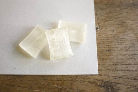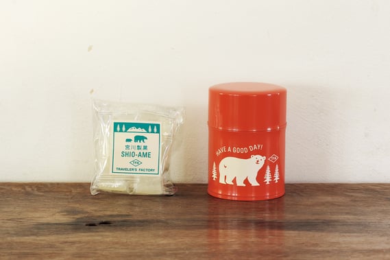 赤い<SS>サイズには、「宮川製菓」さんの塩飴をセット。中目黒で80年以上こだわりの飴を作り続けている宮川製菓さんの塩飴は、安全で上質な素材を使い、昔ながらの銅鍋による直火炊き製法で職人が少量ずつ作っています。砂糖の甘さとほんのり漂う塩の味が不思議なハーモニーを奏で、旅の疲れをやさしく癒してくれます。