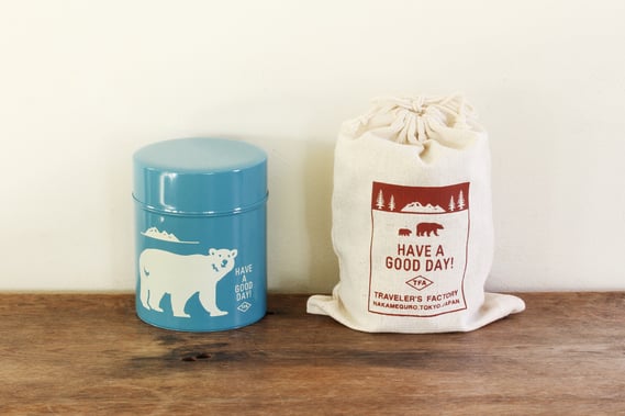 青の<S>サイズには、「ひなのや」さんにシロクマをイメージしてつくって作ってもらったトラベラーズファクトリーオリジナルのパン豆、ホワイトチョコ クランベリー味をセット。パン豆のさくさくした食感にホワイトチョコの甘みとアクセントとしてクランベリーの甘酸っぱさが加わった、冬にぴったりのお菓子です。缶は、コーヒーや紅茶、お菓子などの保存や小物入れとしても使えます。
