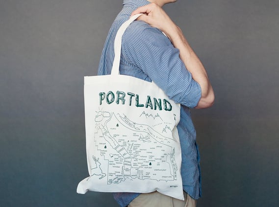 ブルックリンやポートランド、ロサンゼルスなどの街の名前とともに、ゆるいタッチで描かれた地図が印刷されたトートバッグは、温かみのある手作り感が魅力。旅が好きな方にはぴったりのバッグです。
