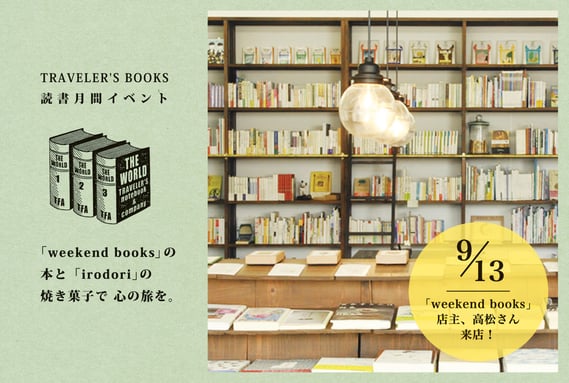 9月13日(土)には、「weekend books」の店主、高松さんがトラベラーズファクトリーに来てくれます。この日は本のコーナーを2階に移し、高松さんとお話ししながら、ゆっくり本を選んでいただけます。旅に持っていきたい1冊、大切な人に送りたい本などなど、本についてのお話しを楽しみながら、ゆるやかな時間を過ごしてください。(高松さんは17時頃まで在店予定です。)