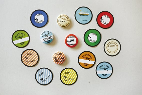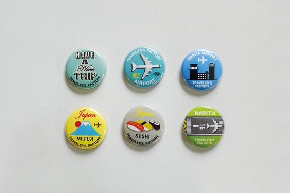 バッグや帽子、ジャケットなどに付けられるバッジタイプと、トラベラーズノートのゴムに付けられるチャームタイプ、新たに加わったマグネットタイプよりお選びいただけます。