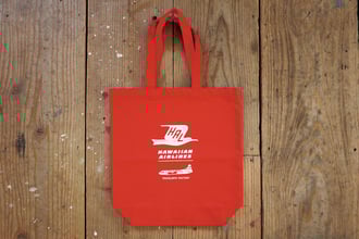 赤の帆布に白でハワイアン航空のヴィンテージロゴと飛行機をプリントしました。厚めの丈夫な帆布製で、A4が入るサイズなので、日常使いにもおすすめです。上のコットンバッグとあわせてぜひ。