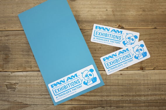 また、パンナム展とあわせて、トラベラーズファクトリー中目黒では、税込1500円以上お買い上げの方に、「パンナム展記念ステッカー」をプレゼントします。パンナムの子供向けの機内グッズ用キャラクター、ピエール・パンダが描かれた、ノートリフィルにぴったりのステッカーです。こちらはなくなり次第終了となりますのでご了承ください。
