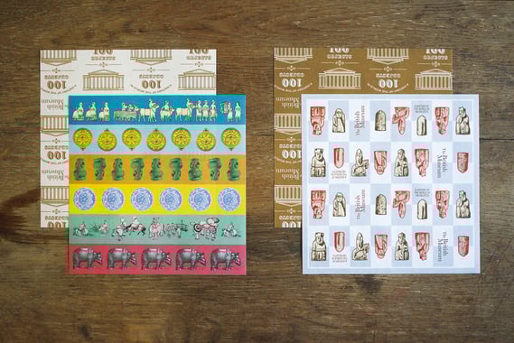 展示品が描かれたカラフルなコレクション柄と、チェス板をイメージしてデザインしたルイス島のチェス柄の2種類です。それぞれ、2柄各10枚(計20枚)入です。