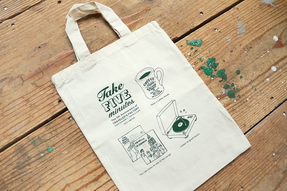 美味しいコーヒーを飲んだり、素敵な音楽を聴いたり、1日に何度かそんな5分間を過ごしてほしい、との思いでデザインしたコットンバッグです。