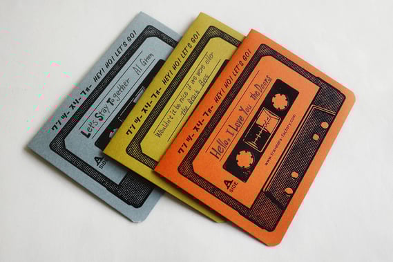 パスポートサイズに、箔押しでカセットテープのデザインを表現しました。表紙はA面、裏表紙はB面になっています。