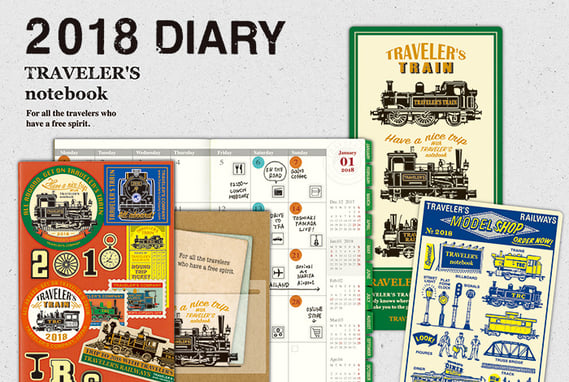 ダイアリーに付属のシールやガイドは、トラベラーズトレインをレイアウトしました。さらに、表紙をカスタマイズしたり、インデックスやスケジュールシール、ポケットシールなどがセットされたダイアリーカスタマイズシールもトラベラーズトレインの車体や汽車にまつわるモチーフをもとにデザイン。そしてもちろん、トラベラーズノート専用下敷きの2018バージョンも登場します。
