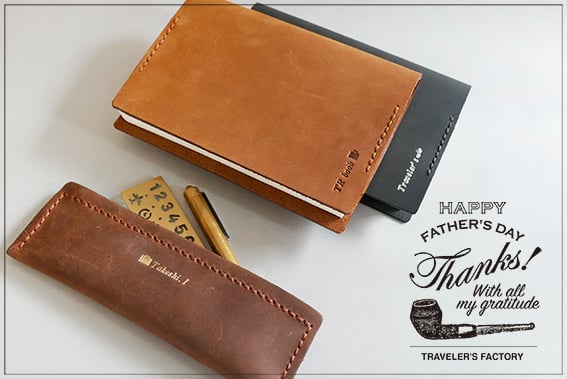 もうすぐ父の日というとで、父の日ギフトにもおすすめのアイテムとして、トラベラーズノートの革を使用したオリジナルのブックカバーとペンケース<S>をピックアップ。トラベラーズノートでご好評いただいているオーダー名入れに対応します。