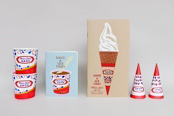 レギュラーサイズは、表紙にソフトクリームをデザイン。アイスのツヤ感も表現しているので、丸めて手に持てば、ミスター・ソフティー気分が味わえます。パスポートサイズは、お持ち帰りにおすすめのカップアイスをプリント。