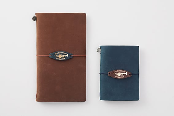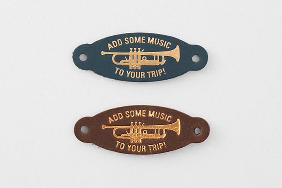 ゴムに通すことで、簡単にトラベラーズノートに取り付けることができるオリジナルデザインのレザータグ。トラベラーズノートの革をタグの形に型抜きし、2019年ダイアリーのテーマでもある「ADD SOME MUSIC TO YOUR TRIP!」のメッセージをトランペットのシルエットとともにゴールドの箔押しで表現しました。