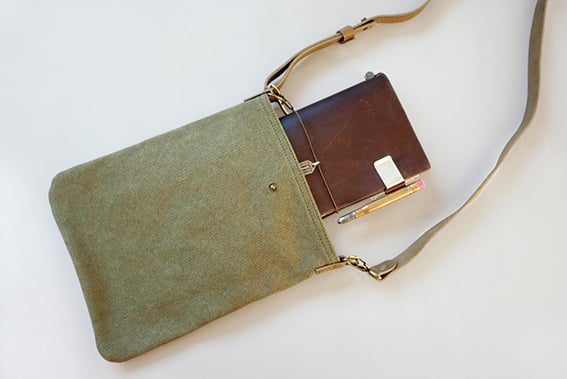 こちらはちょっとしたお出かけに便利なキャンバスショルダーバッグ。ショルダーベルトはトラベラーズノートの革で作りました。使うほどに味わい深く変化し、柔らかく体になじんでいきます。