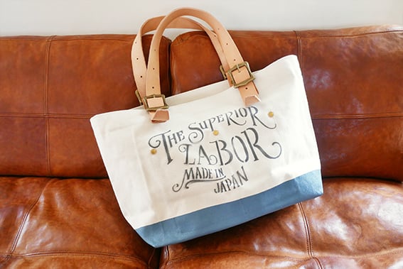 シャトル織機で一日2反しか織れない倉敷産帆布、東京下町で作られた真鍮金具、タンニンでなめされた国産のヌメ革を使い、縫製・塗装・洗い・組み立てを岡山の工房で手作業を行われて完成する、シュペリオールレイバーを代表するアイテム、エンジニアトートバッグ。こちらは、ステンシルのデザインやボトムのペイントの色を選ぶことができるオーダーも中目黒の店頭にて受け付けています。(オーダーは仕上がりまで約3ヶ月かかります)