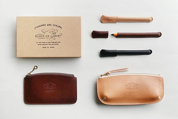 倉敷産の帆布、東京下町で作られた真鍮金具、タンニンなめしの国産のヌメ革を使用し、素材から日本の職人たちに手によって作られた、シュペリオールレイバーを代表するアイテムのエンジニアトートバッグから、オイルをたっぷり含んだオリジナルのレザーで作ったペンケースなどの革小物、シュペリオールレイバーの定番エンジニアポーチなどが並びます。