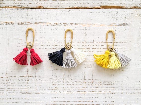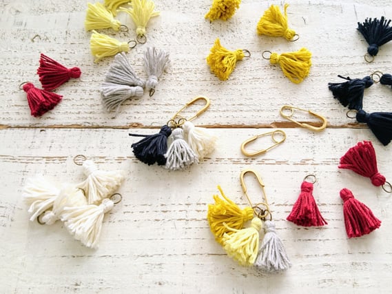 沢山のコットンのタッセルの中からお好きな色をを選び、ブローチピン、キーホルダー、バッグチャームの中から選んだお好きな金具と合わせて、自分だけのオリジナルタッセルアクセサリーが作れる、タッセルバイキングを開催。short fingerさんのニット帽やKO'DA STYLEさんのバッグ、さらにトラベラーズノートのチャームにもおすすめです。