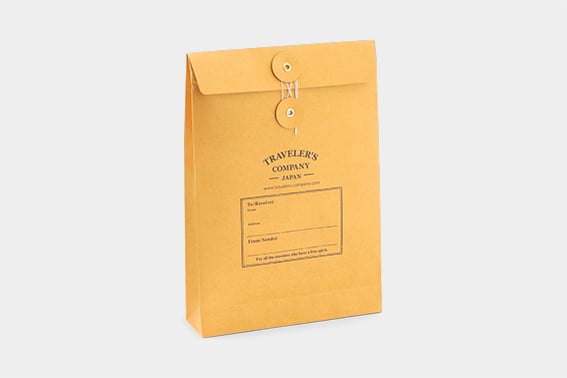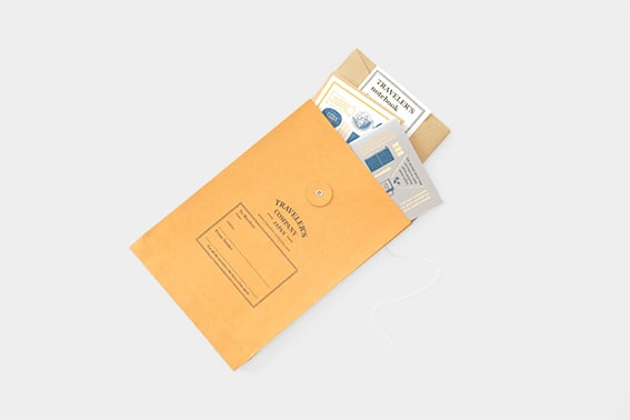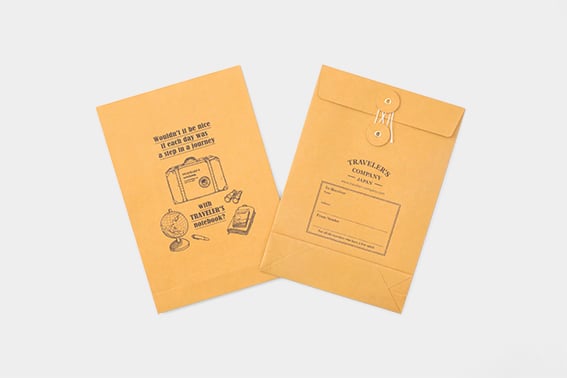 トラベラーズノートにリフィルやブラスペンなどがちょうど入るサイズになっています。開け閉めができる紐付きの封筒になっていますので、もらった後もリユースできます。