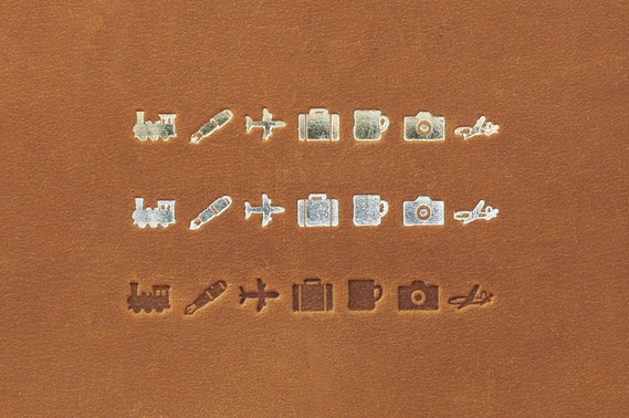 文字に加え、飛行機やトランクなどトラベラーズファクトリーオリジナルマークを刻印して、世界にたったひとつのトラベラーズノートを作ることができる「オーダー名入れ」。