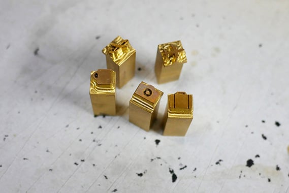 栗山さんの名入れは、活字を組み合わせて箔押し機にセットし、熱と圧力で革に刻印して出来上がります。レーザー刻印よりも、深くしっかり出るのが特徴ですが、革の厚みや質感によって温度や圧力を変えたり、経験と技が必要な名入れ方法でもあります。名入れ職人として35年以上の経験を持つ栗山さんだからこそ、ナチュラルで個体差があるトラベラーズノートの革にキレイに名入れをすることが可能なのです。