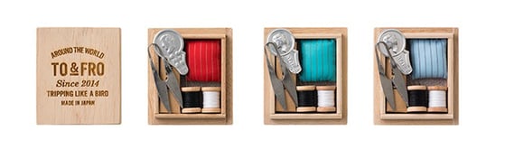 金沢で縫い針や加賀毛針の製造を行う針の老舗、目細八郎兵衛商店とコラボレートした小さな裁縫箱。目細針5本、ハサミ、糸通し、糸巻き2色と針山が桐箱に入っています。内貼りと針山にはTO&FROのオリジナル生地を使用。旅に持っていけば先での急なボタン付けなど、アクシデントを救ってくれます。