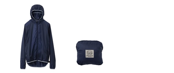 Mサイズで約60gと、フード付きウィンドブレーカーでは世界最軽量クラス。撥水機能付きの生地を使用。折りたたんで内ポケットに収納すれば手のひらサイズになり、携帯に便利です。脇にはムレを防ぐためのベンチレーション機能を付け、袖口には手の甲までカバーできるよう親指を入れられるサムホールもプラスされています。