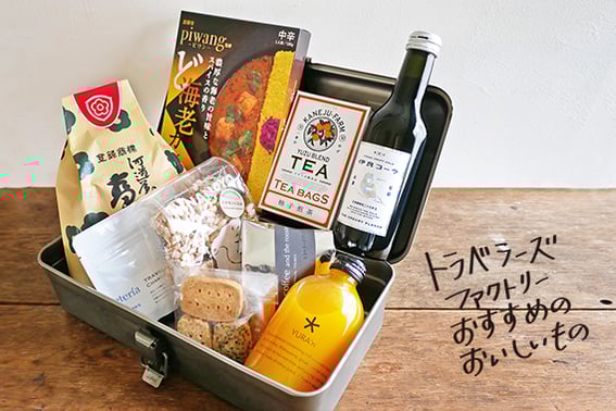 まずは飲み物は、トラベラーズファクトリーの定番「アアルトコーヒー」のトラベラーズブレンドと「カネ十農園」のお茶に加え、周年缶でもおなじみの「teteria」のトラベラーズカモマイルミルクティーが登場します。お茶番頭とも呼ばれている大西進さんが、トラベラーズファクトリーのために選んでくれた、煮出しミルクティー用の茶葉です。ミルクで煮出して飲むと、リンゴのようなカモマイルの香りの濃厚なミルクティーが楽しめます。