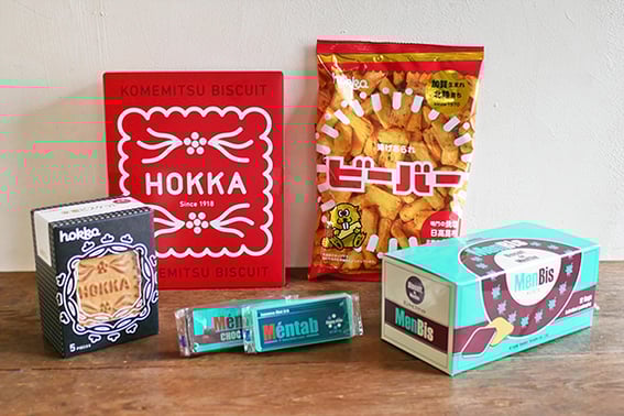 右から、中目黒の人気パン屋さん関口ベーカリーのショートブレッド、愛媛県西条市のポン菓子屋さん「ひなのや」のポン菓子、そして京都の老舗菓子舗「河道屋」の蕎麦ほうる。どれもコーヒー、紅茶、お茶との相性もぴったりです。