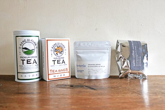 9周年缶にセットしたトラベラーズファクトリーおすすめの飲み物。コーヒーは、おなじみアアルトコーヒーのトラベラーズブレンド。紅茶は、teteriaのトラベラーズカモマイルミルク、日本茶はカネ十煎茶。お好みにあわせてぜひ!