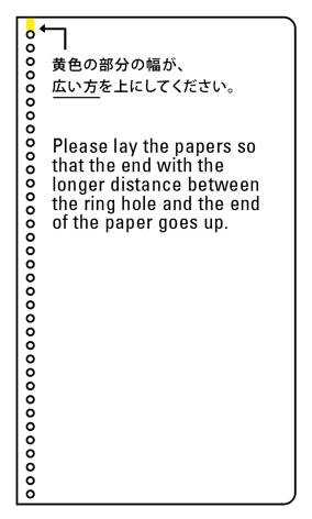 There are both an upper and lower direction for the inner papers. Please lay the papers so that the end with the longer distance between the ring hole and the end of the paper goes up. The end with the shorter distance between the end of the paper and the hole goes on the bottom. Please align the papers so that the ring holes go on the left, and set them on the tray.
