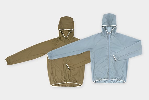 薄くて軽く、撥水機能付きのhumming birdを使用。折りたたんで内ポケットに収納すれば手のひらサイズになるため、いつでもどこでも持ち歩くことができる高機能ウインドブレーカーです。