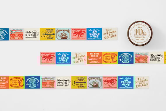 1周年から続くトラベラーズファクトリーの周年ロゴのデザインが10種連なったマスキングテープです。