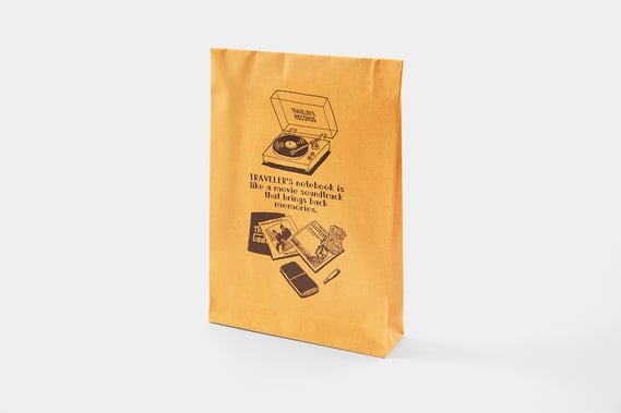風合いのあるクラフト紙にどこか懐かしい紐付きの封筒のようなギフトバッグで、本体には2022年ダイアリーのテーマ、映画のサウンドトラックをイメージしたイラストとともに、「TRAVELER’S notebook is like a movie soundtrack that brings back memories.(トラベラーズノートは記憶をよみがえらせてくる映画のサウンドトラックのようだ)」とプリントしています。