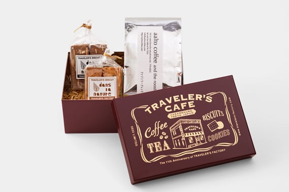 缶はマットボルドーに塗装し、「TRAVELER'S CAFE」をテーマにデザインしたグラフィックをプリント。その中にトラベラーズファクトリーがおすすめするコーヒーと紅茶にそれぞれお菓子を組み合わせた、2種類のセットをご用意しました。