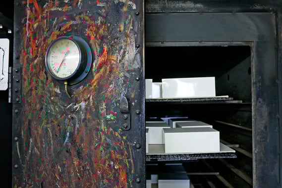 塗装後は、窯に入れて焼き付けます。缶の色やサイズ、さらに気温によって窯に入れる位置や、温度、時間を替える必要があるそうです。いろとりどりのペンキが付いた年季の入った窯の鉄扉が、モダンアートみたいにかっこいいですね!