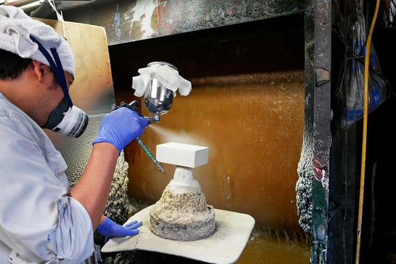 出来上がった缶をひとつずつ丁寧に拭き、細かな汚れや油分を取り除いてから、缶をろくろに載せ、塗料を吹き付けます。吹き付け過ぎると塗料がたれ、吹き付けが足りないと色むらになるので、均等に吹き付ける必要があります。この工程も熟練の技を必要とします。50年前程に先輩職人の方がハンドメイドで造った塗装ブースを受け継いで今でも使っています。