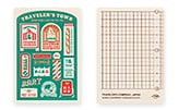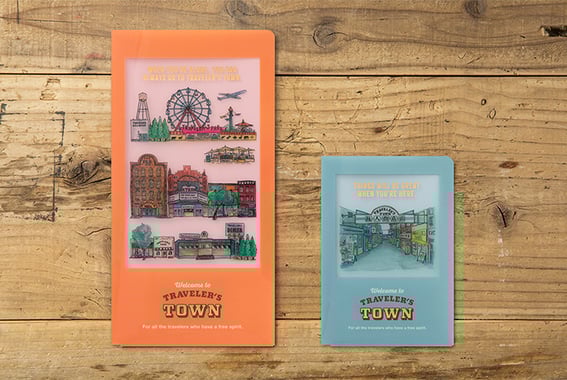 立ったまま書いたり、しおりにして瞬時にそのページを開いたり、直線を引いたり、旅先でのさまざまなシーンで便利な下敷。2024年版は、トラベラーズタウンをテーマにデザインしました。レギュラーサイズはトラベラーズタウンのマップを、パスポートサイズはトラベラーズタウンの商店街に並ぶお店の看板をデザインしました。