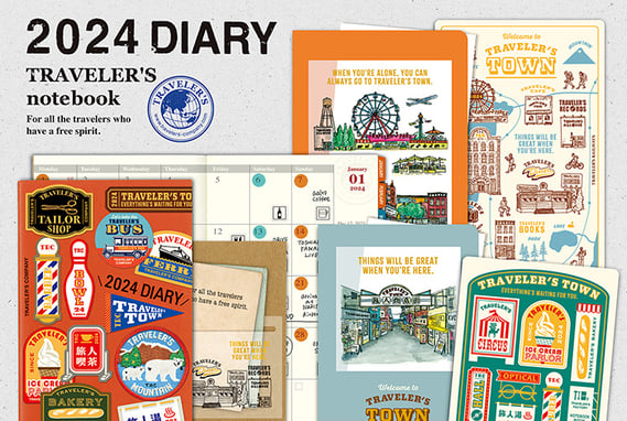 2024年版限定の下敷やクリアホルダー、ダイアリーのカスタマイズシールは、トラベラーズタウンをイメージしてデザインしました。世界中で旅人が行き交い、街は賑やかになってきました。そんな姿は、街に活気を生み、旅に出たいという気持ちを喚起してくれます。世界のどこかにトラベラーズタウンがあって、そこを旅すれば、気分も上がり、前向きになれる。トラベラーズタウンを旅するような気分で2024年を過ごしてほしい。そんな想いでトラベラーズタウンをテーマにしました。
