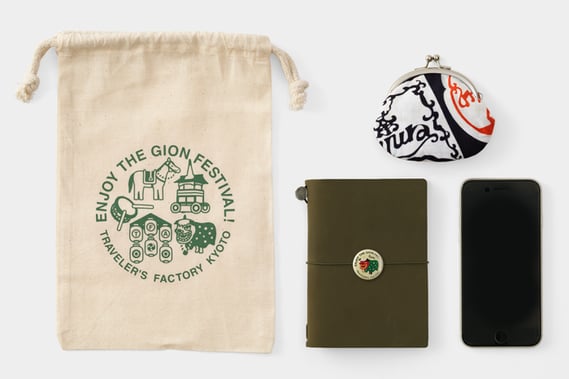 今年は7月15日より、祇園祭限定コットンバッグを発売します。山鉾や提灯、太鼓などの祇園祭モチーフのデザインをプリントしたトラベラーズノートがぴったり入る巾着タイプのコットンバッグです。浴衣を着て祇園祭に参加する際の小物入れにもぴったりです。