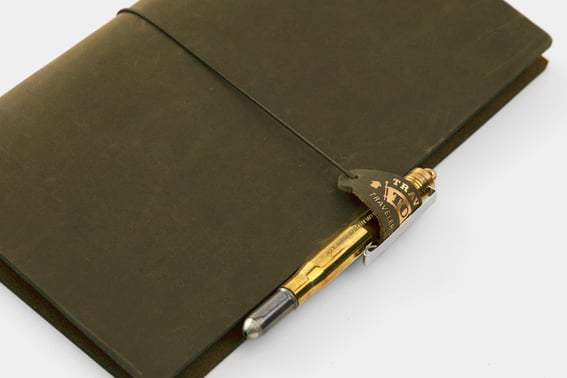 トラベラーズノートのゴムに付けることで、レザータグがつまみのようになりノートが開きやすくなり、さらにペンをひっかけてペンホルダーとして使うこともできます。