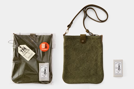 トラベラーズノート レギュラーサイズに加えて文庫本や財布などが入るバッグは、日々のちょっとしたお出かけにはもちろん、旅先での街歩きにもおすすめのサイズです。バッグのショルダーベルトにぴったりのブラスキーチェーンをセットしました。旅にも日常にも便利な道具を組み合わせたギフトセットです。