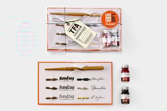 6種類のニブ(ペン先)と木製のペン軸がセットされ、初心者の方でも気軽にカリグラフィを楽しみことができるBrauzeカリグラフィ&ライティングセットに、エルバンのインク「トロピカルコーラル」と「ビルマの琥珀」の2色をセットしています。どちらも上品で華やかな色で、カリグラフィにもおすすめのインクになります。紙や書くことが好きな方へのギフトにおすすめです。