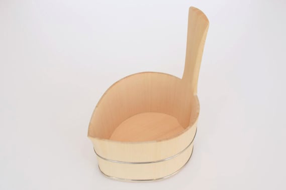 中川木工芸 中川周士氏による初代湯道具のひとつ。酒器の片口の技法を桶に施しているので、かけ湯をすると、肩から湯が一筋の流れを描きながら綺麗におちていきます。名前の由来は、セットとなる桶立てに飾ることで、正面から桶をみると「狐の顔」の形になることから。
